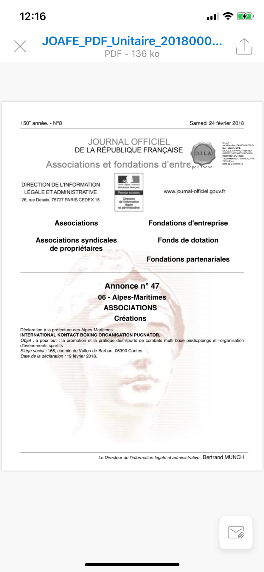 KONTACT BOXING PROTECTED DISCIPLINE INPI : N°4451992